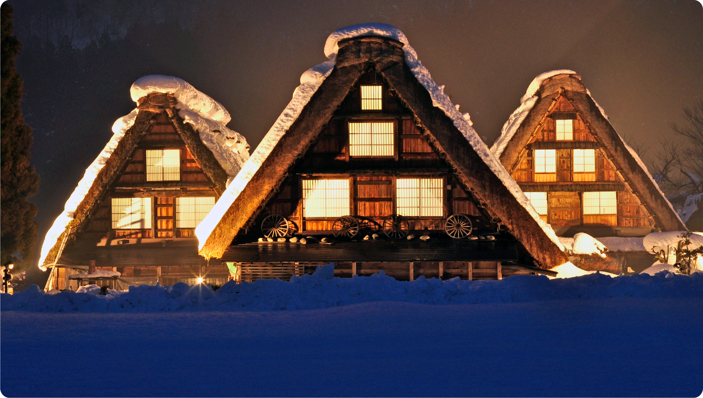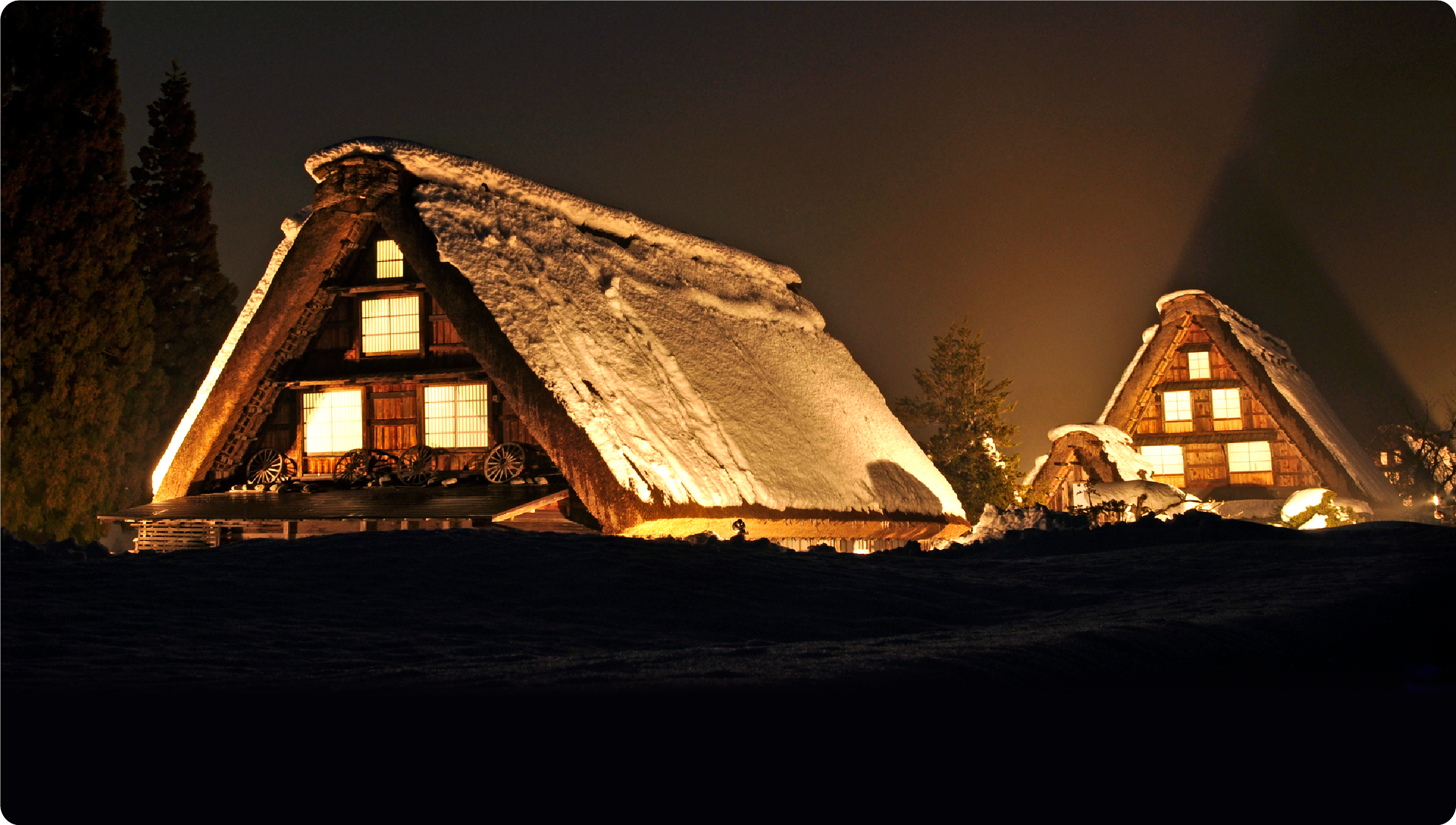 As the snow continues to fall, lights come on in the windows of the Gassho-style houses, and the snow piled up on the thatched roofs is illuminated in white by the light of the lamps.